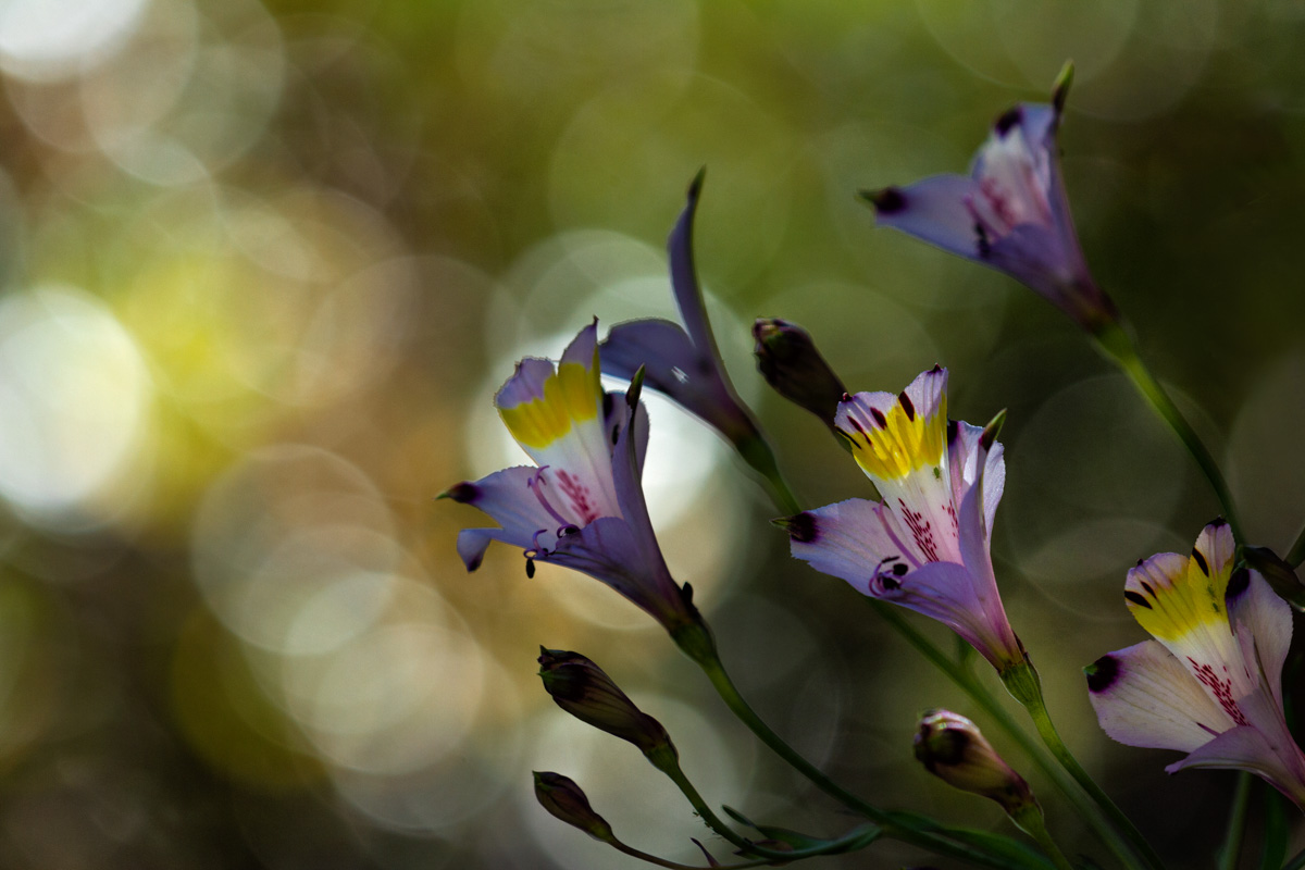 Al mirar hacia las flores en altura, las luces se filtraban entre los árboles, la forma de aprovecharlas era desde lejos. Con el tele empecé a buscar la sincronía de la luz y el bokeh, con las alstroemerias.
