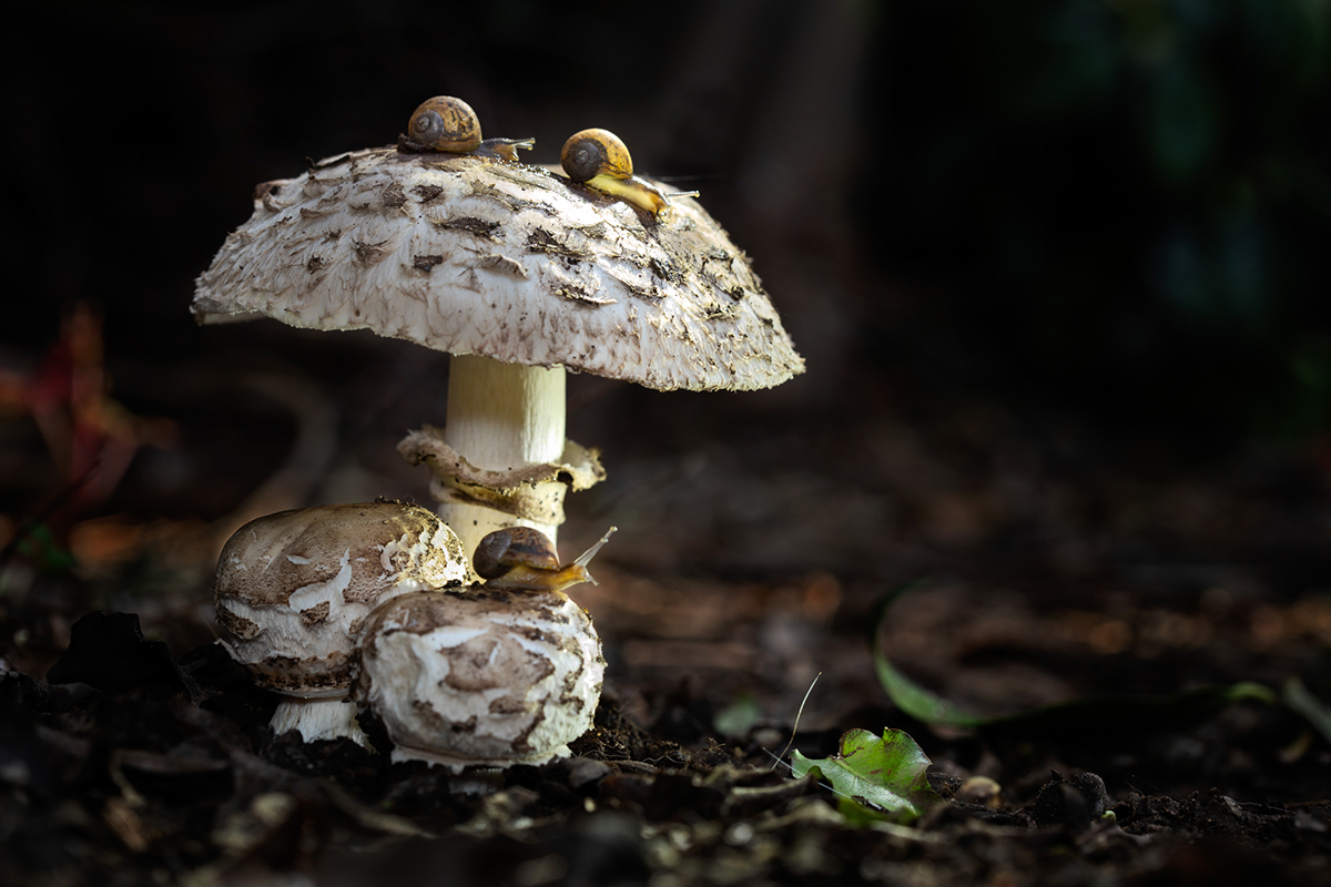 Estando en cuarentena en casa, aparecieron unos hongos en mi jardín. Esa vez tuve la imagen previa en mi cabeza: Caracoles con los cachitos al sol, avanzando encima de los hongos.